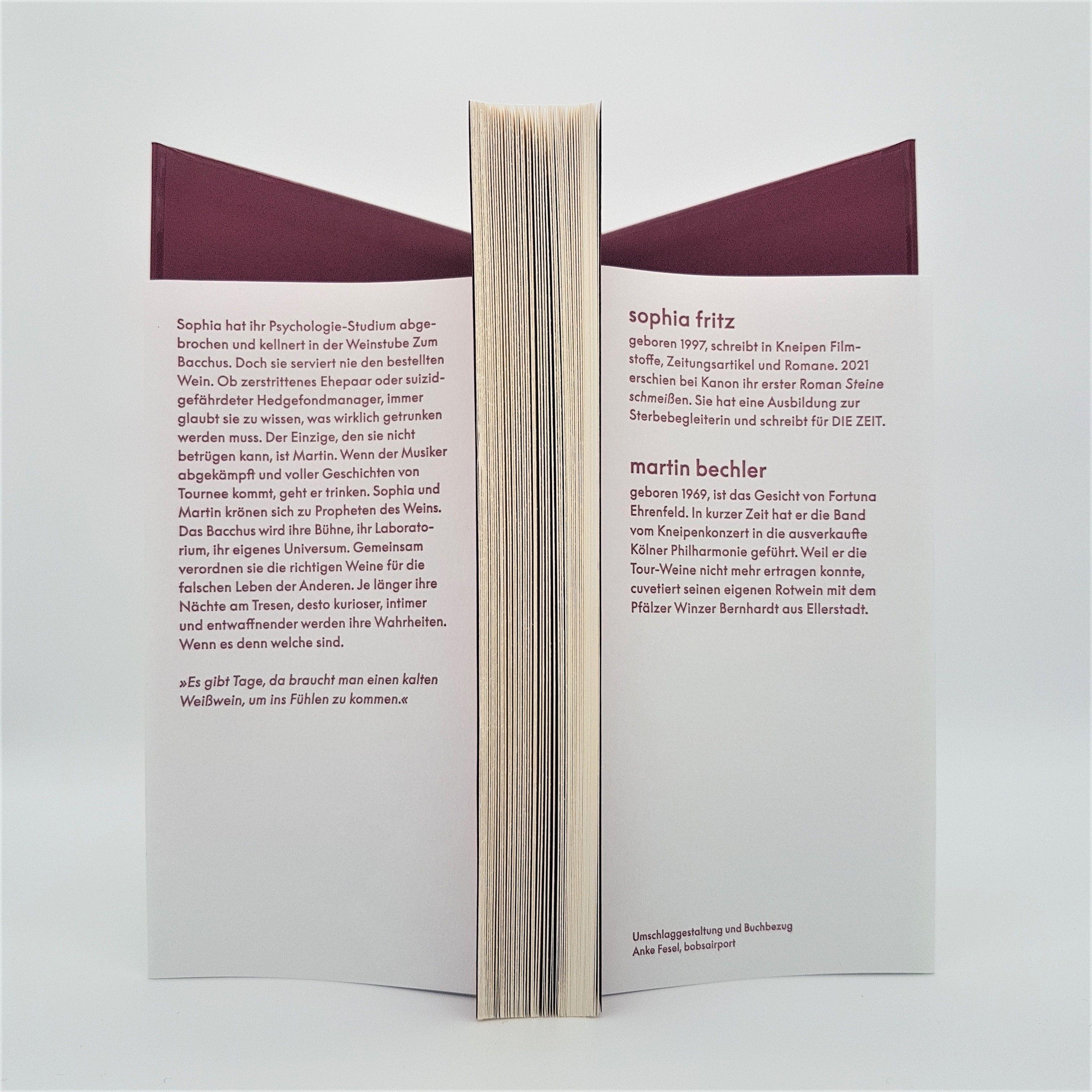 Der richtige Wein im falschen Leben.Eine Studentin, Anfang 20, und ein Musiker, Mitte 40, werden auf Umwegen beste Freunde. Mit krassen Geschichten und dem richtigen Wein stehen sie sich bei. Dieses Buch ist der Weisheit letzte Stuss und eine Ode an die Önologie.Sophia hat ihr Psychologie-Studium abgebrochen. Um ihr Leben zu finanzieren, kellnert sie in der Weinstube Zum Bacchus. Sie serviert nie den bestellten Wein. Ob zerstrittenes Ehepaar oder suizidgefährdeter Hedgefondmanager, immer glaubt sie zu wissen, was getrunken werden muss. Der Einzige, den sie nicht betrügen kann, ist Martin. Immer wenn der Musiker abgekämpft und voller Geschichten von Tournee kommt, geht er trinken. Sophia und Martin krönen sich zu Propheten des Weins. Das Bacchus wird ihre Bühne und ihr Hörsaal. Gemeinsam verordnen sie die richtigen Weine für die falschen Leben der Anderen. Je länger ihre Nächte am Tresen, desto kurioser, intimer und entwaffnender werden ihre Wahrheiten. Wenn es denn welche sind.Dies ist die Weinbegleitung für das Leben selbst, ein Wohlbekomms auf die krassen Momente unserer Existenz: Was trinke ich, wenn ich meine Ex-Freundin schwanger im Supermarkt wiedergetroffen habe? Wenn die Apokalypse nun wirklich ansteht, die Aliens gelandet sind oder sich das Herz mal wieder aufgrund der periodisch gescheiterten Liebe aus allen erdenklichen Seiten ausblutet? Was trinke ich, wenn ich eigentlich nicht mehr trinken wollte?