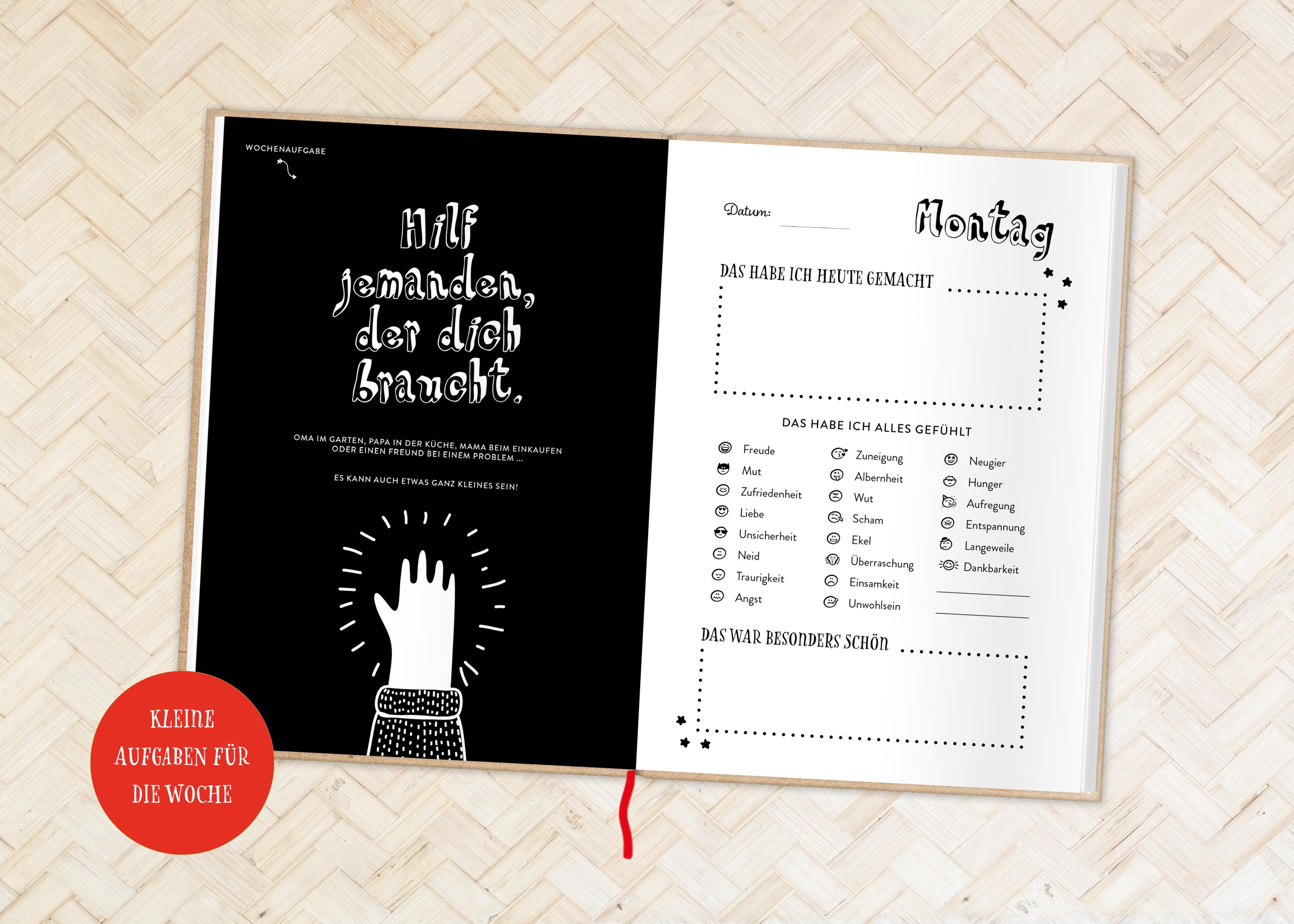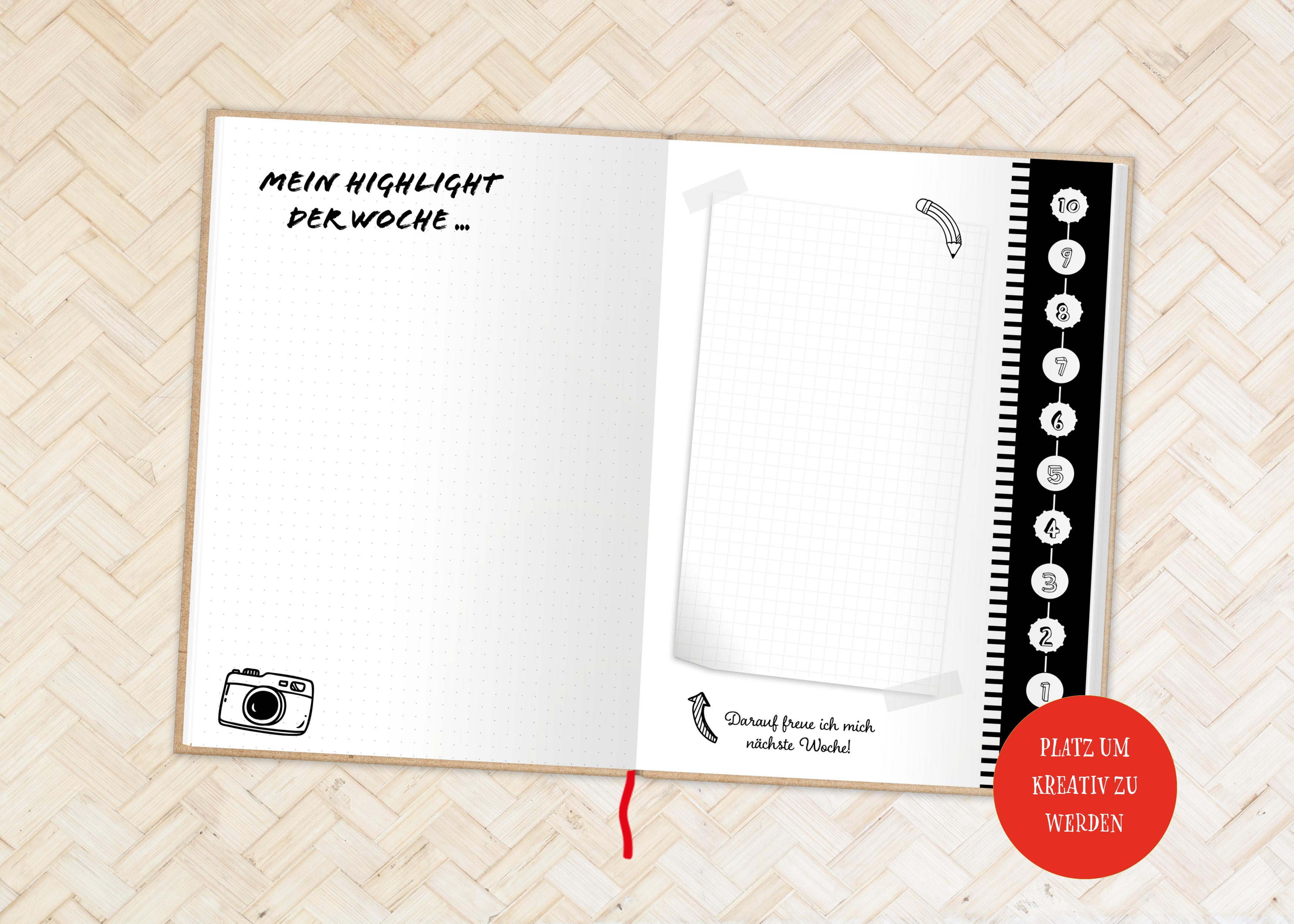 Neben fordernden Wochenaufgaben und klassischen Tagebuchseiten gibt es viel Platz zum Reflektieren. Auf diesen Seiten können eure Kinder ihrer Kreativität freien Lauf lassen, kritzeln, Fotos einkleben oder ein Bild von ihrem schönsten Moment malen.