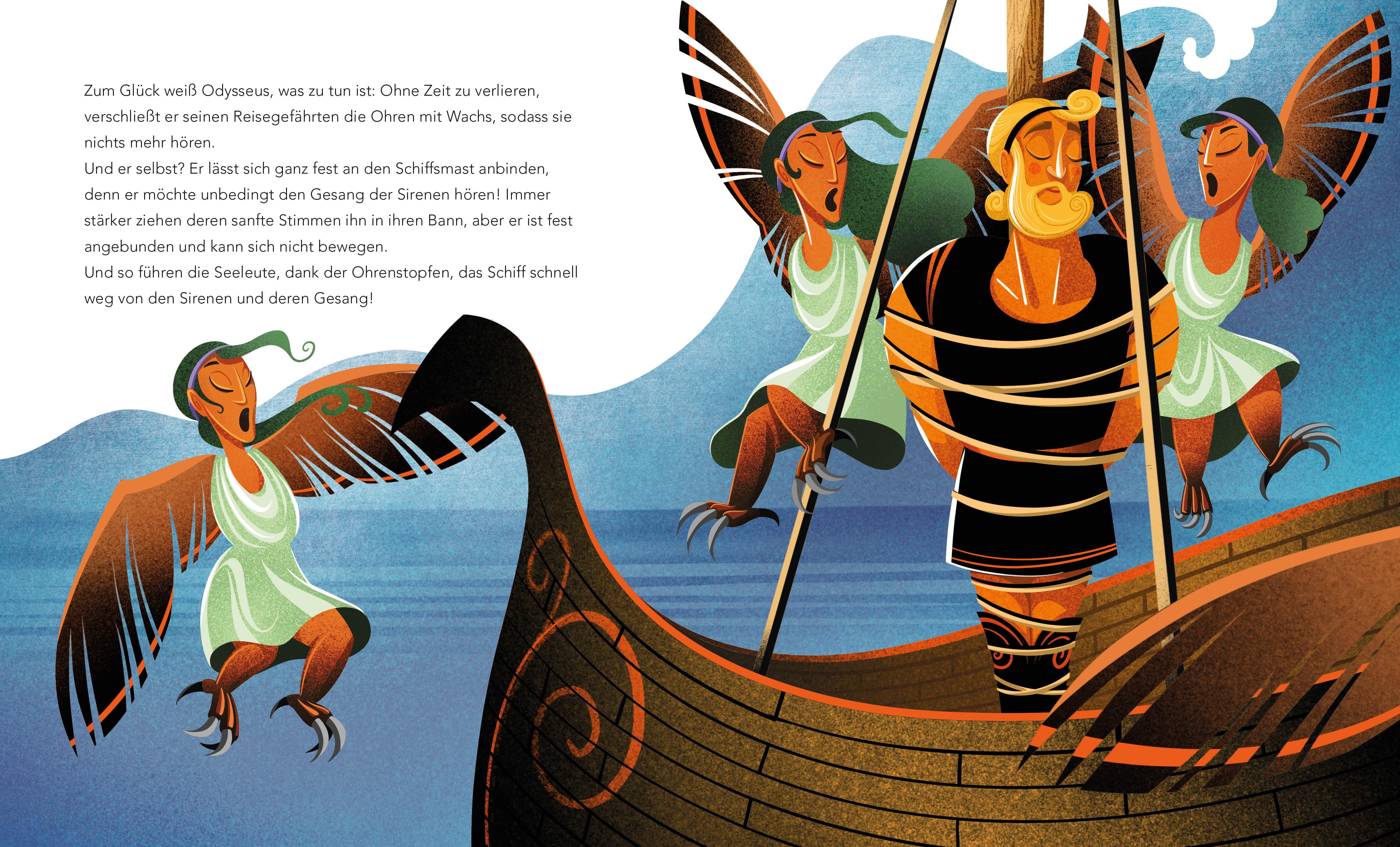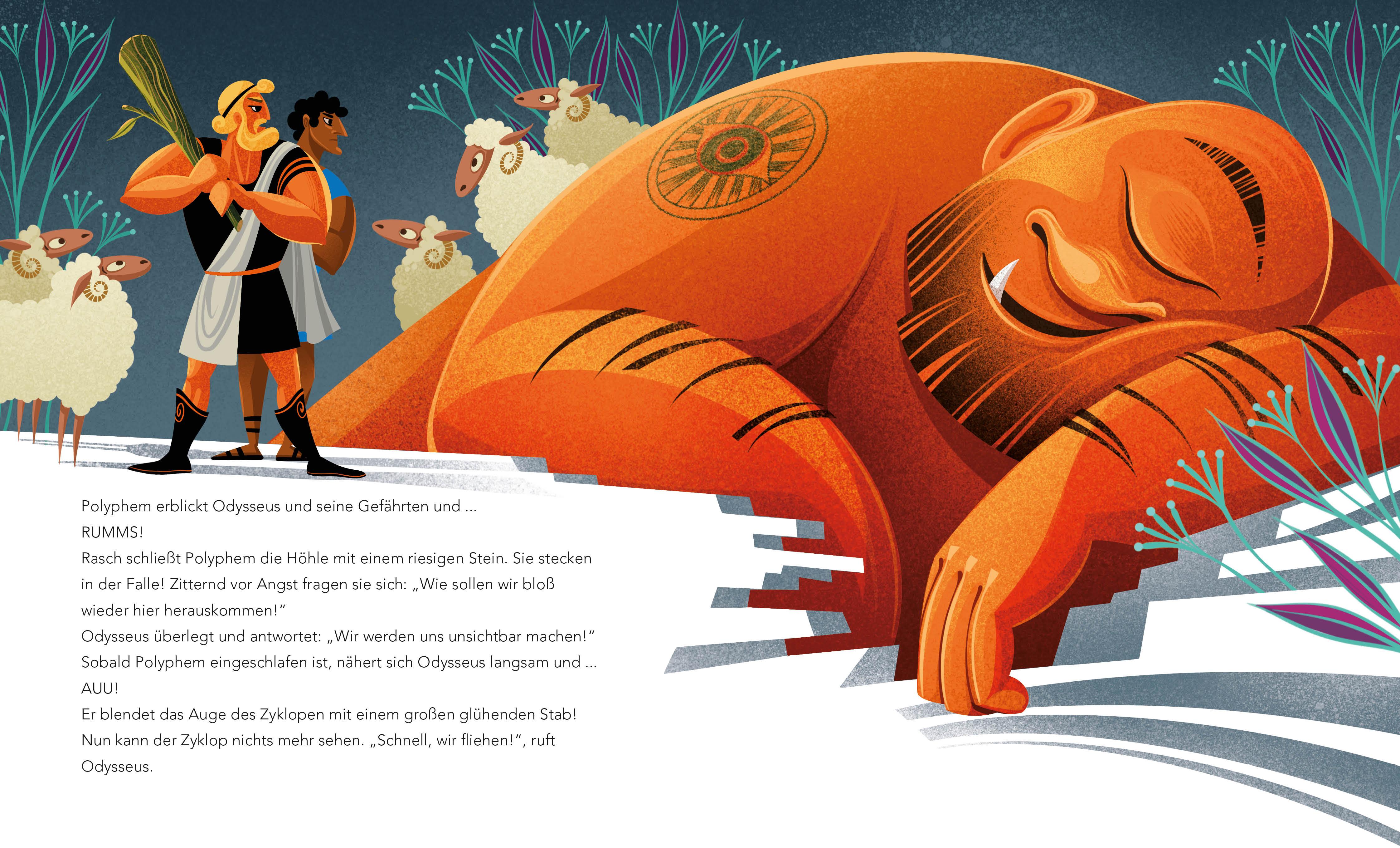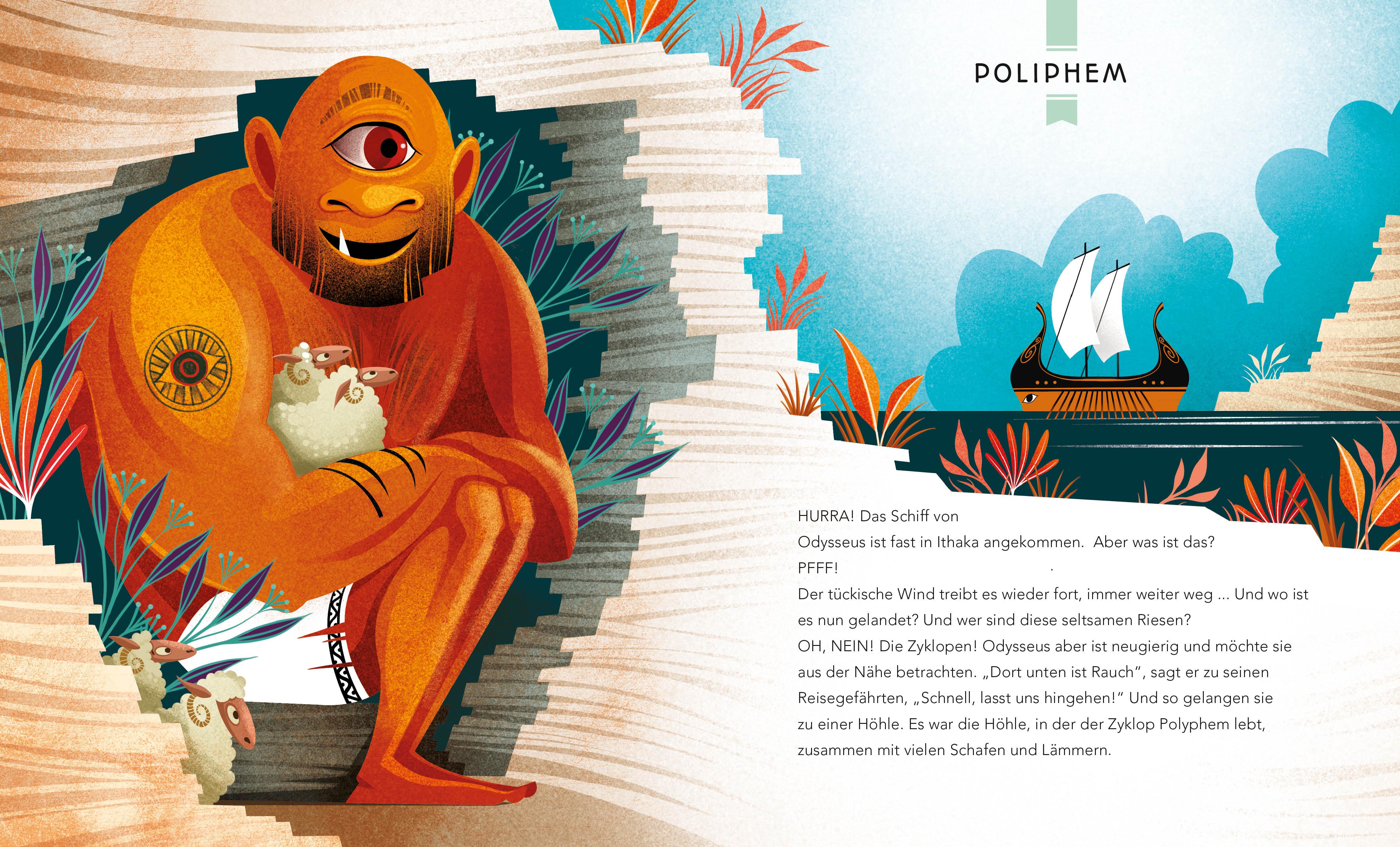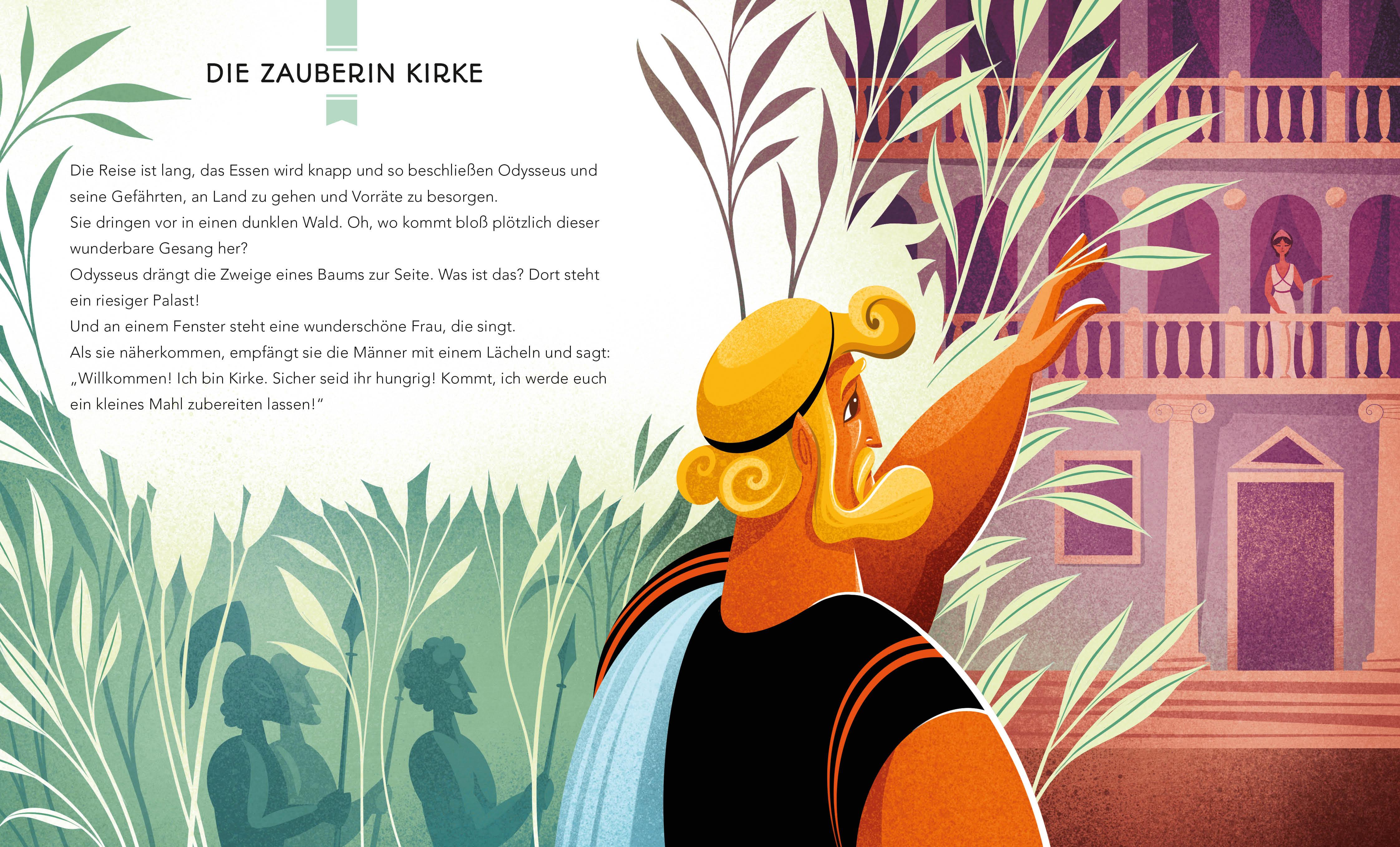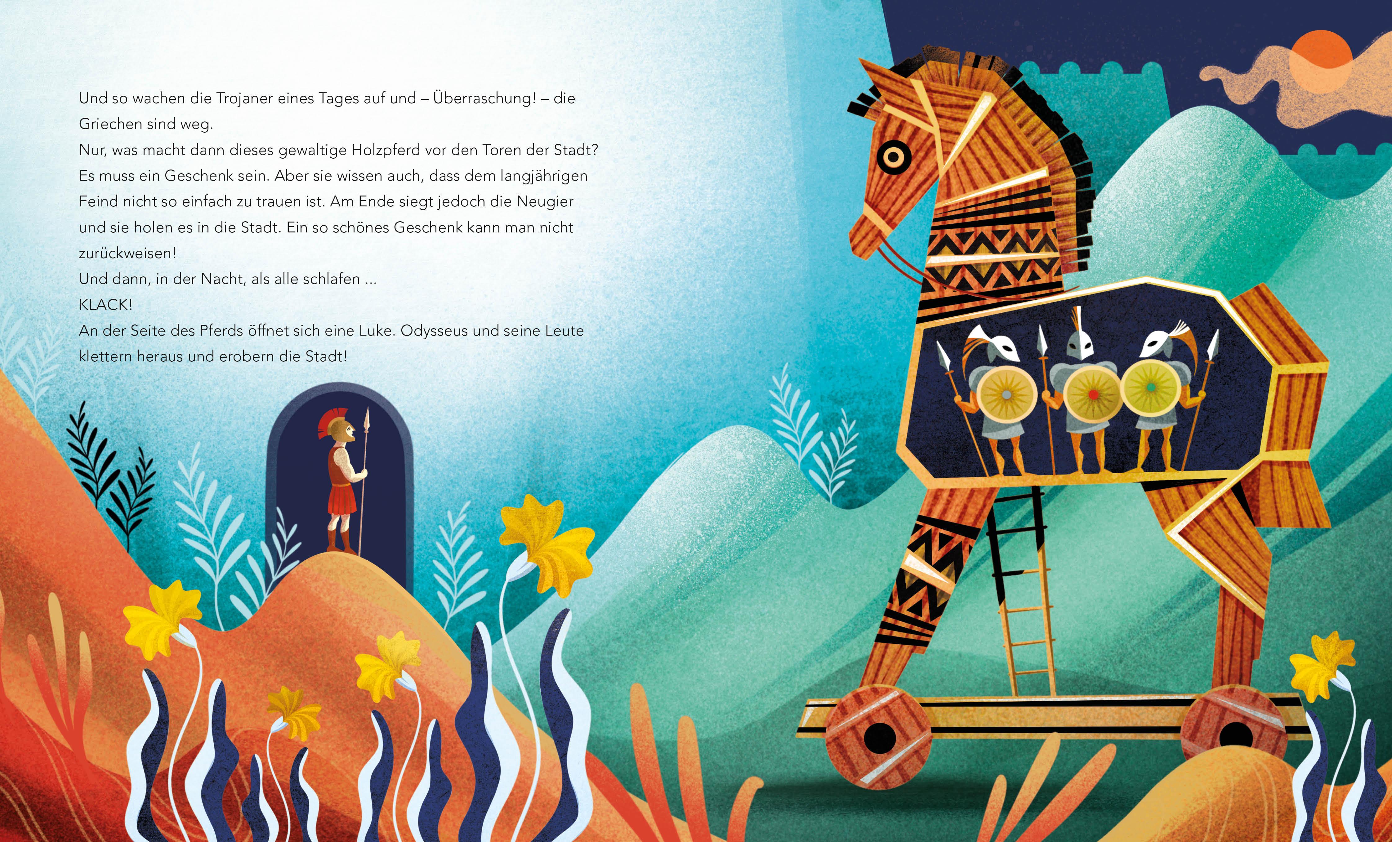Homers Odyssee ist einer der wichtigen Texte der abendländischen Kultur. In dieser Buchreihe lernen die Kleinsten zum ersten Mal die faszinierende Welt der klassischen griechischen Mythologie kennen. Jede Ausgabe widmet sich in kindgerechter Sprache den bekanntesten und beliebtesten Helden, Göttinnen und Göttern. In diesem Buch wird die Abenteuergeschichte des Odysseus illustriert, der auf seinen Unternehmungen Heldentaten vollbringt und sich gefährlichen Situationen stellen muss. Er bringt die Griechen auf die Idee, in einem hölzernen Pferd heimlich in die Stadt Troja einzufallen. Er blendet den Zyklopen und entkommt den gefährlichen Sirenen.