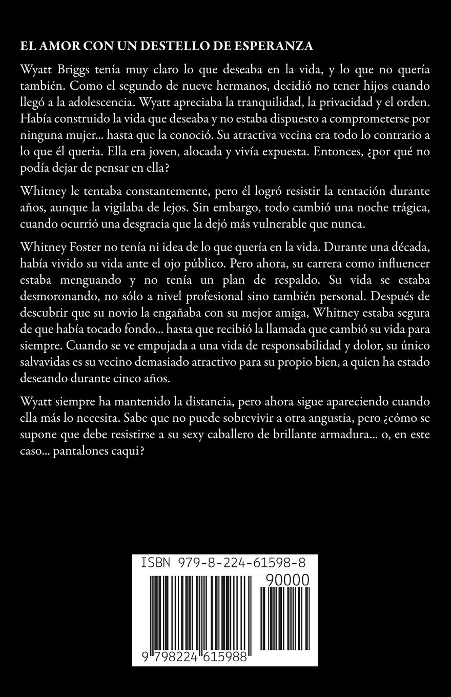 Wyatt Briggs tenía muy claro lo que deseaba en la vida, y lo que no quería también. Como el segundo de nueve hermanos, decidió no tener hijos cuando llegó a la adolescencia. Wyatt apreciaba la tranquilidad, la privacidad y el orden. Había construido la vida que deseaba y no estaba dispuesto a comprometerse por ninguna mujer... hasta que la conoció. Su atractiva vecina era todo lo contrario a lo que él quería. Ella era joven, alocada y vivía expuesta. Entonces, ¿por qué no podía dejar de pensar en ella?Whitney le tentaba constantemente, pero él logró resistir la tentación durante años, aunque la vigilaba de lejos. Sin embargo, todo cambió una noche trágica, cuando ocurrió una desgracia que la dejó más vulnerable que nunca.Whitney Foster no tenía ni idea de lo que quería en la vida. Durante una década, había vivido su vida ante el ojo público. Pero ahora, su carrera como influencer estaba menguando y no tenía un plan de respaldo. Su vida se estaba desmoronando, no sólo a nivel profesional sino también personal. Después de descubrir que su novio la engañaba con su mejor amiga, Whitney estaba segura de que había tocado fondo... hasta que recibió la llamada que cambió su vida para siempre. Cuando se ve empujada a una vida de responsabilidad y dolor, su único salvavidas es su vecino demasiado atractivo para su propio bien, a quien ha estado deseando durante cinco años.Wyatt siempre ha mantenido la distancia, pero ahora sigue apareciendo cuando ella más lo necesita. Sabe que no puede sobrevivir a otra angustia, pero ¿cómo se supone que debe resistirse a su sexy caballero de brillante armadura... o, en este caso... pantalones caqui?